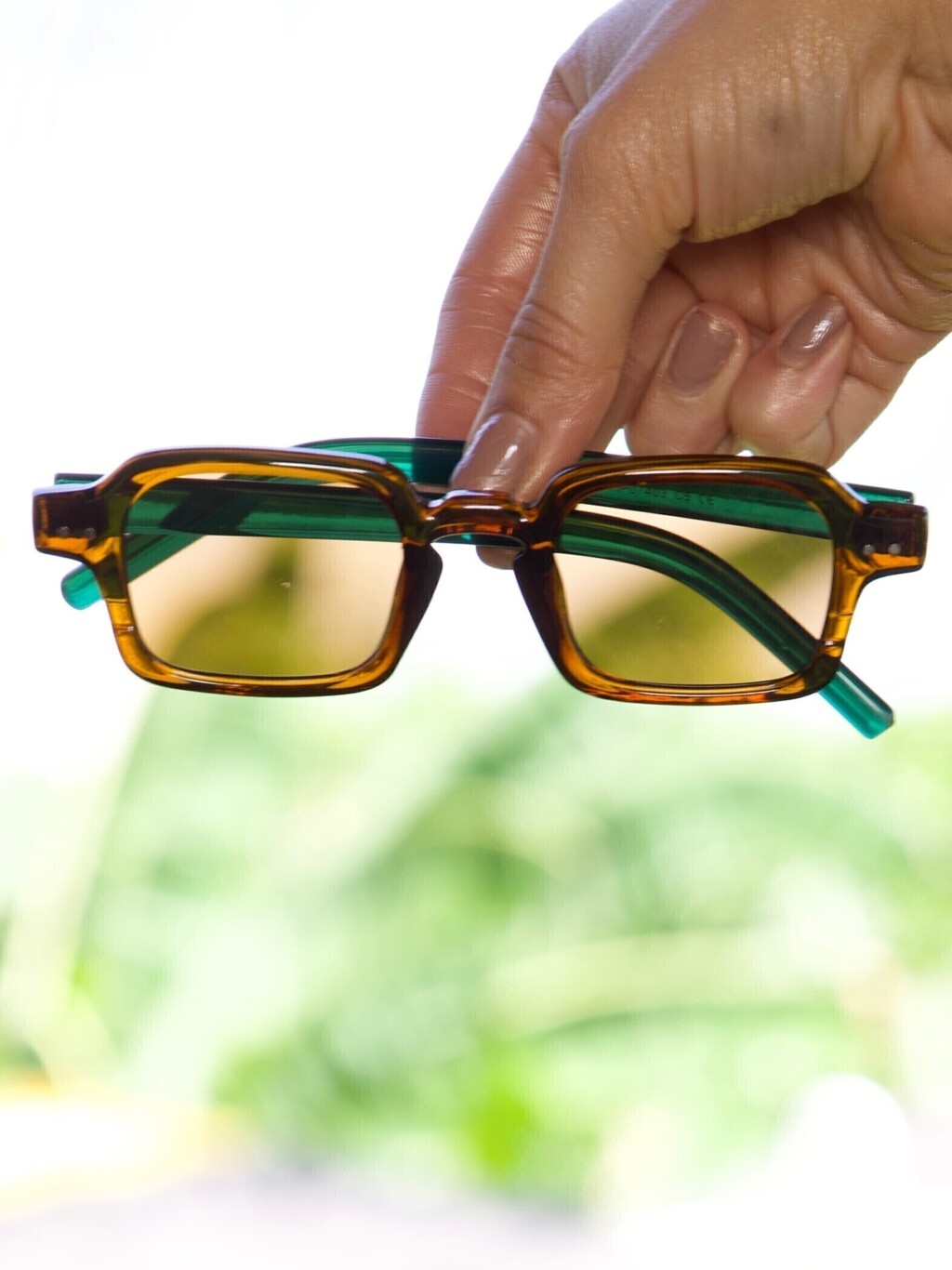 Óculos Harlem quadrado acetato marrom com hastes verdes e proteção UV400. Ideal para revenda entre R$59,90-R$199,90. Compre no atacado Clush!