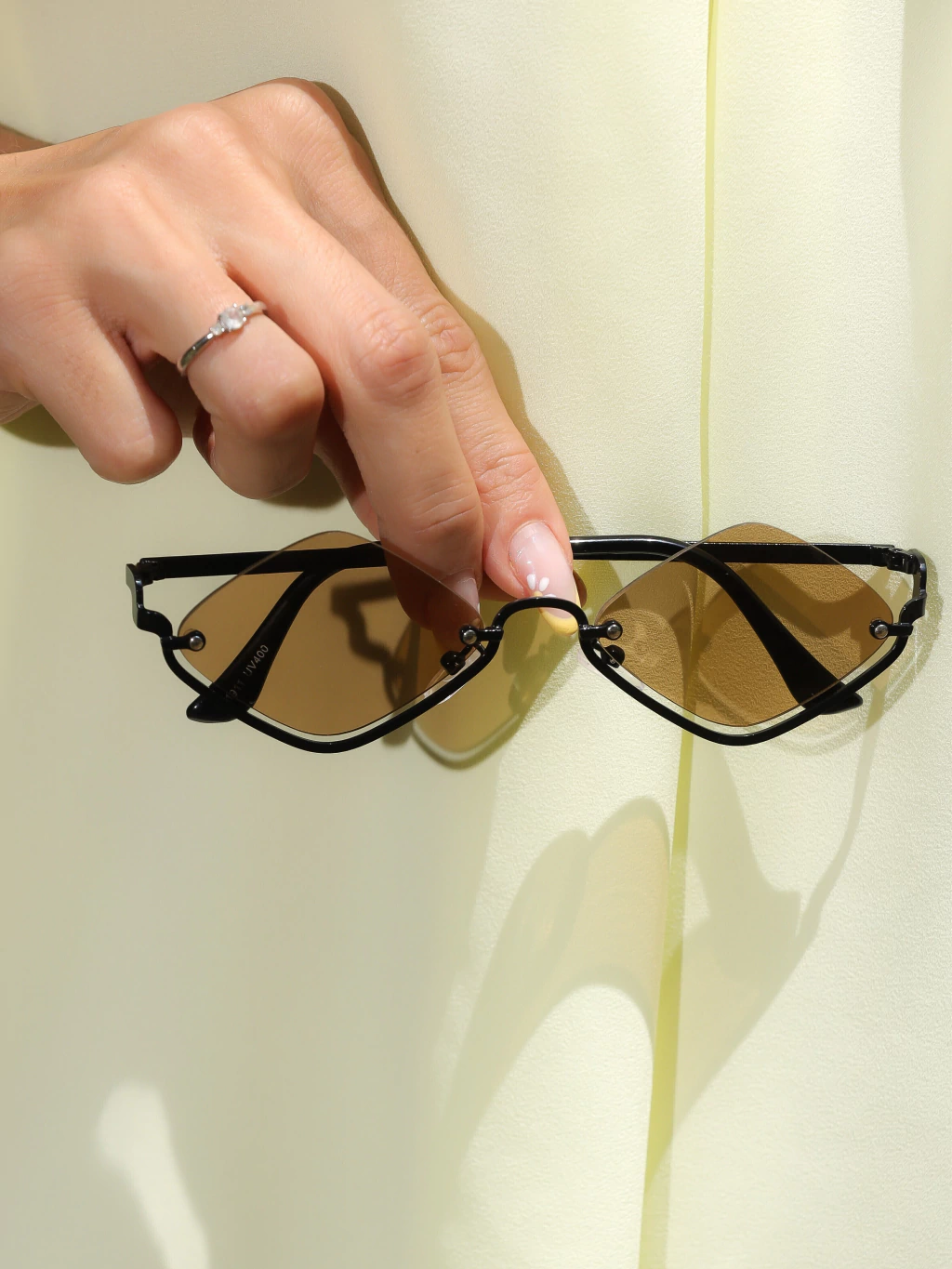 Óculos Naomi 2.0 lente marrom, armação preta em metal. Formato losango moderno para revenda. Compre no atacado Clush com ótima margem de lucro!