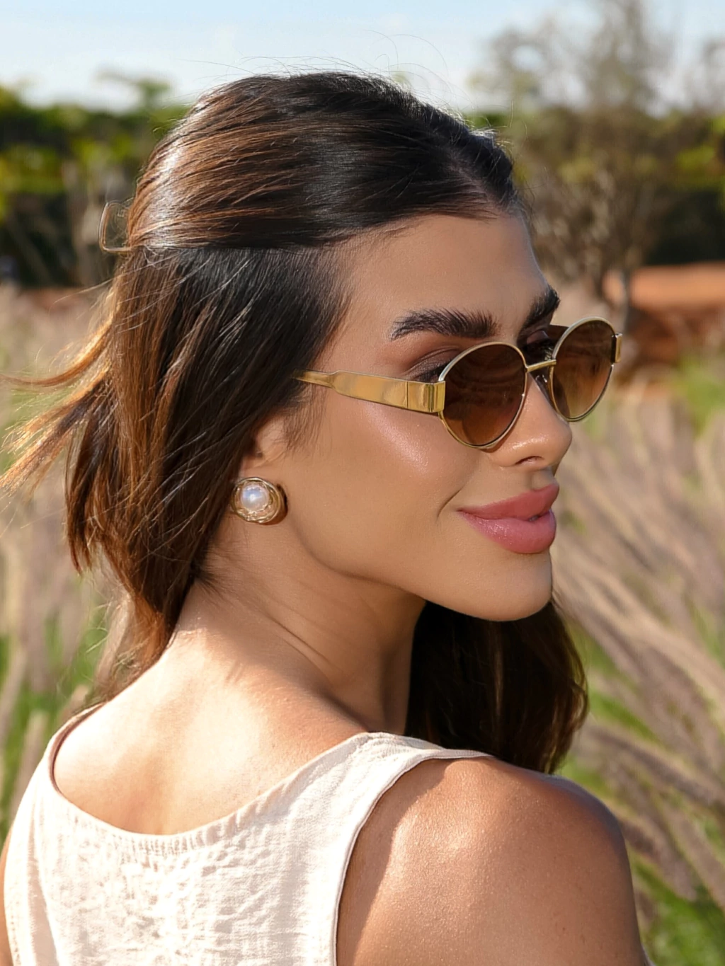 Com formato oval e armação em metal, ele traz aquela cara de rica que toda mulher merece. Com 14 cm de largura total, se adapta lindamente a rostos ovais, redondos e quadrados, criando um look refinado e versátil. A proteção UV400 cuida dos seus olhos enquanto a lente resistente a riscos mantém o óculos sempre impecável.